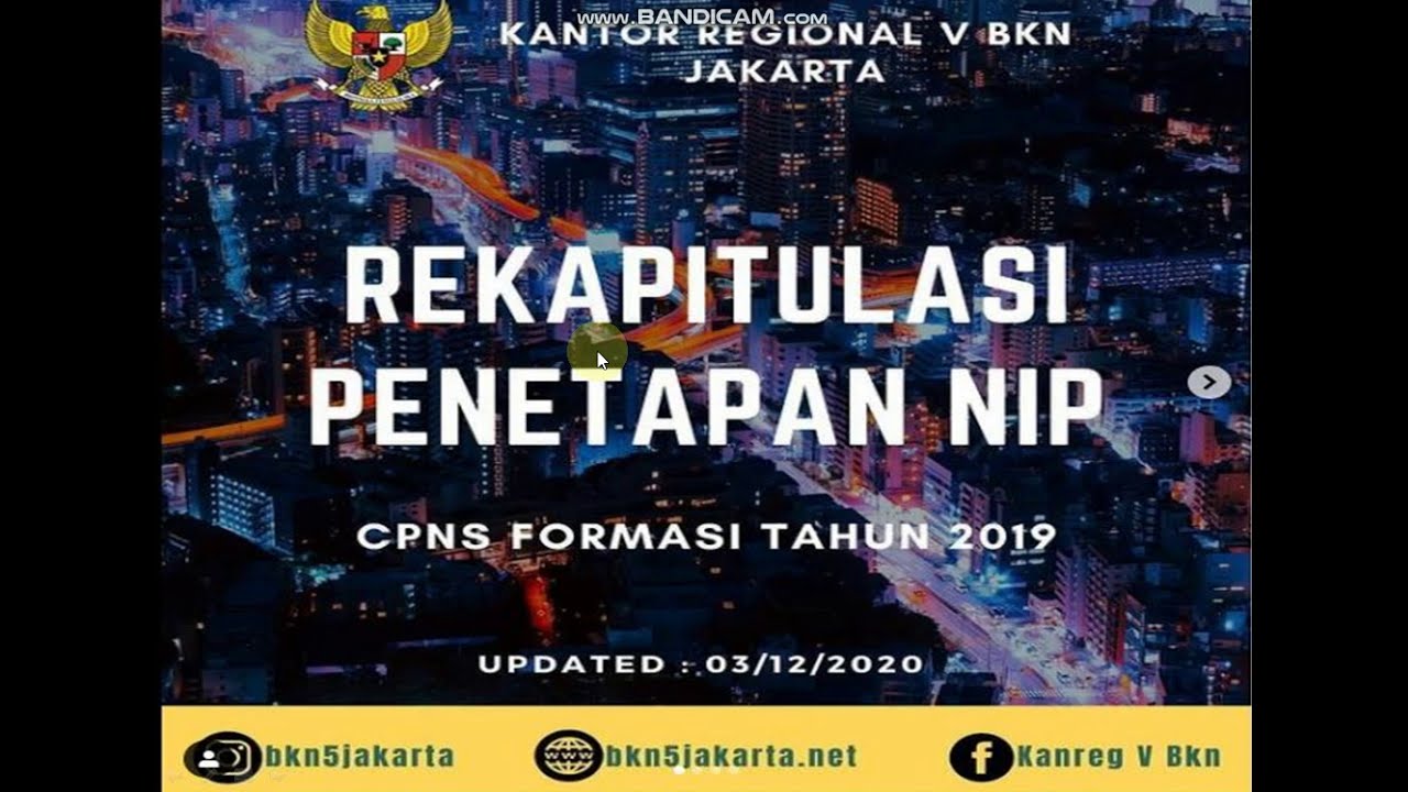 Penetapan nip cpns 2019 kanreg bkn se indonesia (update#7) 10 desember 2020 подробнее. Hingga hari ini jumat (27/11/2020) telah terbit pertek dan penetapan nip (data hanya menampilkan formasi umum) untuk 11 instansi di wilayah kerja kanreg iv bkn. Pengusulan nip sendiri disampaikan ke bkn (badan kepegawaian negara) paling lambat tanggal 30 november 2020. Pemerintah, melalui kementerian pendayagunaan aparatur pendaftaran cpns 2019 direncanakan dimulai pada tanggal 11 november 2019 secara online melalui pengusulan penetapan nip: Pemprov, pemkot dan pemkab) dan kondisi keuangan negara.